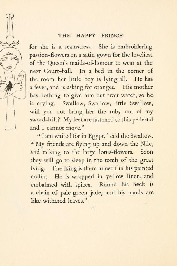 La frivola Rondine per amore del Principe ubbidisce, nonostante l'incipiente inverno, procrastinando un giorno dopo l'altro la partenza per l'Egitto, dove è attesa dalle compagne. Una terra luminosa, questa, calda, piena di meraviglie di cui dipinge all'amico ipnotiche visioni: «Gli raccontò delle ibis rosse che stanno ritte in lunghe file sulle sponde del Nilo, e catturano col becco pesci d'oro; della Sfinge, che è vecchia quanto il mondo, e vive nel deserto, e sa ogni cosa; dei mercanti che avanzano lenti sui loro cammelli e portano in mano perline d'ambra; del Re dei Monti della Luna, che è nero come l'ebano, e venera un grande cristallo; del grande serpente verde che dorme in una palma, e ha venti sacerdoti addetti a sfamarlo con torte di miele; e dei pigmei che attraversano un grande lago su ampie foglie piatte e sono sempre in guerra con le farfalle.»