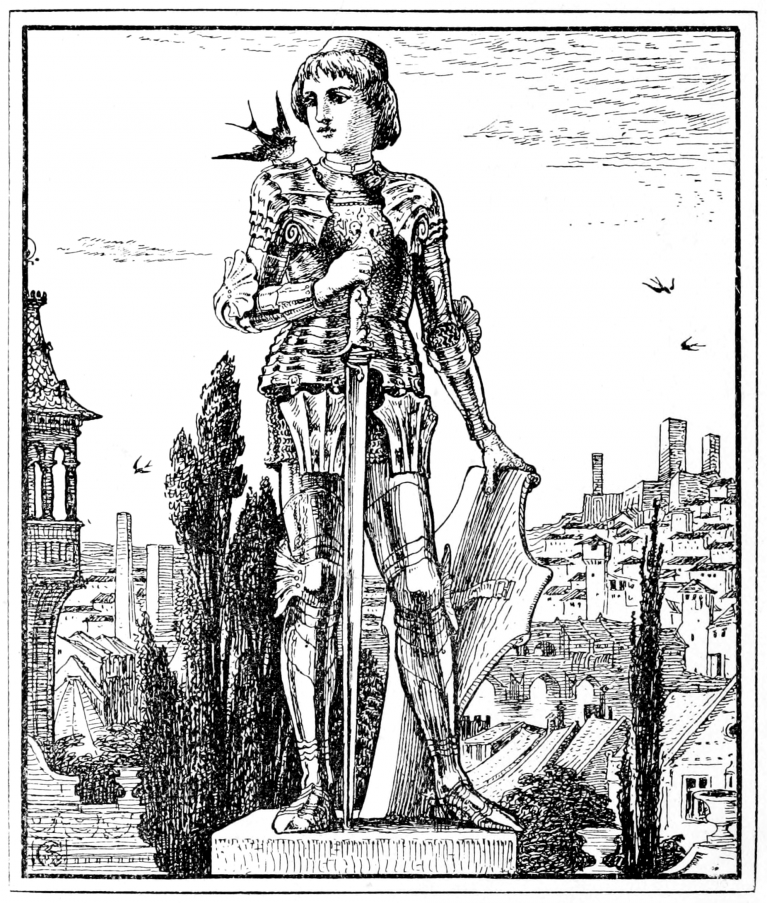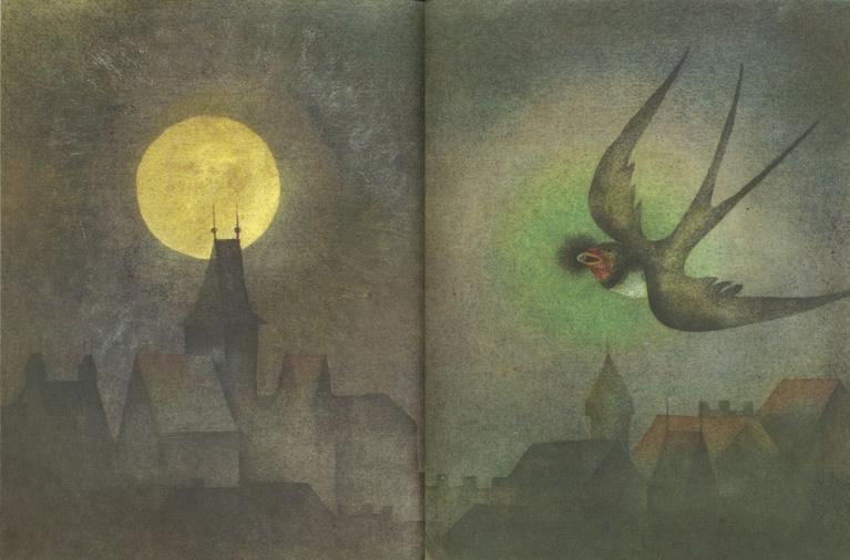 «Laggiù» continuò la statua in tono basso, musicale, «Laggiù in una stradina c'è una povera casetta. Una finestra è aperta, e da questa posso vedere una donna seduta a una tavola. Ha il viso magro e stanco, e le mani ruvide, rosse, tutte bucate dall'ago, perché fa la cucitrice. Ricama passiflore su di una sottana per la più bella damigella d'onore della Regina, che la metterà al prossimo ballo a Corte. In un lettino nell'angolo, giace malato il suo bambinetto. Ha la febbre e chiede delle arance. Sua madre non ha altro da dargli che un po' d'acqua di fiume, e lui piange. Rondine, Rondine, piccola Rondine, vuoi portarle il rubino dell'elsa della mia spada? Io ho i piedi attaccati a questo piedistallo e non posso muovermi.»