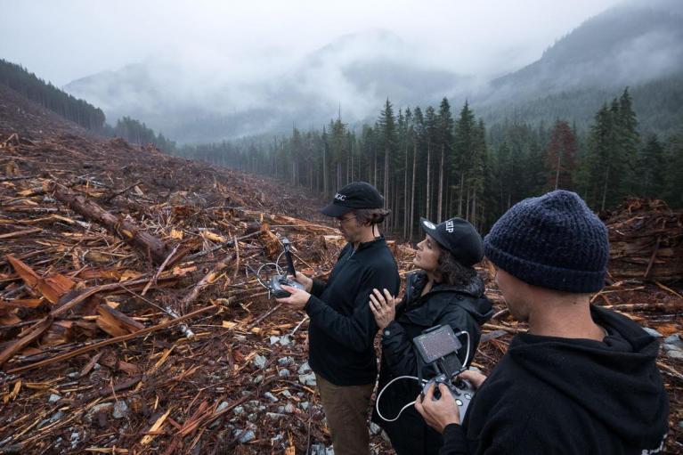 Nicholas de Pencier and Jennifer Baichwal with drone pilot Mike Reid on location at a clearcut north of Port Renfrew, Vancouver Island, British Columbia, © Edward Burtynsky, courtesy Admira Photography, Milan / Nicholas Metivier Gallery, Toronto.