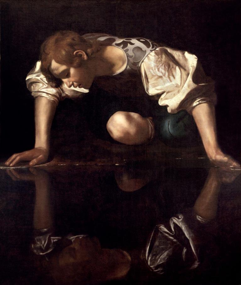 Il mito, narrato da Ovidio nelle sue Metamorfosi, rappresenta due modi di intendere l’identità: quella assoluta di Narciso, che non conosce l’alterità, e quella di Eco che, all’opposto, esiste solo in funzione dell’altro. Non solo: nel 1436, il grande umanista Leon Battista Alberti, vissuto all’epoca della Firenze dei Medici, nel suo De Pictura definisce Narciso “il vero scopritore della pittura … che altra cosa è il dipingere” – si domanda – “che abbracciare e pigliare con l’arte quella superficie del fonte?”. Per Alberti, il bellissimo giovane segna la propria fine come essere vivente nel momento in cui, guardando il proprio riflesso, riconosce se stesso in quanto immagine. E così sembra rappresentarlo Caravaggio più di un secolo dopo: un'immagine che guarda se stessa, un’allegoria della vista, della conoscenza di sé, del rapporto fra uomo e natura, fra uomo e immagine, fra l’uno e il suo doppio. Narciso, vestito da uomo contemporaneo, chino, alla ricerca di un contatto fisico con il suo riflesso, con le braccia disposte ad arco, si specchia nell’acqua e si vede, speculare, nella medesima posa.