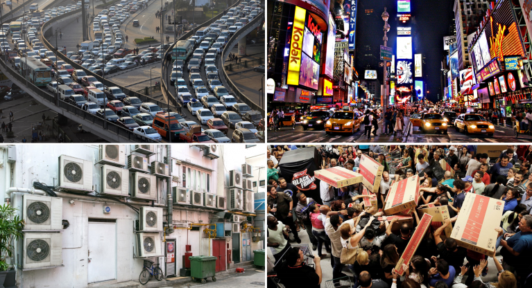 Non avverrà nemmeno attraverso i liberi accordi tra gli stati per la riduzione delle emissioni di gas serra, come quelli sanciti dal trattato di Parigi. Questi accordi, benché utili, non possono provocare i cambiamenti radicali che la transizione esige. Oltre a non essere in alcun modo vincolanti per i firmatari, dato che nessuno stato nazionale sarebbe disposto a rinunciare alla propria sovranità su questa materia (per trasferirla a chi, poi?), essi restano ancorati ai modelli dominanti di organizzazione economica e sociale che forse sono la vera origine del problema. La loro ambizione è di realizzare l’ideale dello sviluppo sostenibile, cioè di eliminare gli effetti climalteranti provocati dalle attuali pratiche di approvvigionamento e consumo energetico, garantendo però per il futuro gli stessi livelli di produzione e di consumo di beni e servizi a cui siamo abituati e stimolandone semmai un aumento ai fini della crescita economica. Prefigurano improbabili scenari di eccesso sostenibile, basati su un principio di sostituzione di tecnologia: dai combustibili fossili all’eolico, dai motori a combustione interna ai motori elettrici, ecc. Guardate le fotografie qui sotto e con uno sforzo di fantasia immaginate che tutte le automobili siano elettriche, che tutte le luci e i condizionatori siano alimentati da enormi parchi eolici off-shore e che tutti i beni di consumo contesi nel Black Friday siano realizzati con, poniamo, il 70% di materiali riciclati: avrete davanti agli occhi una rappresentazione icastica dello sviluppo sostenibile.