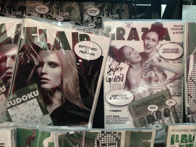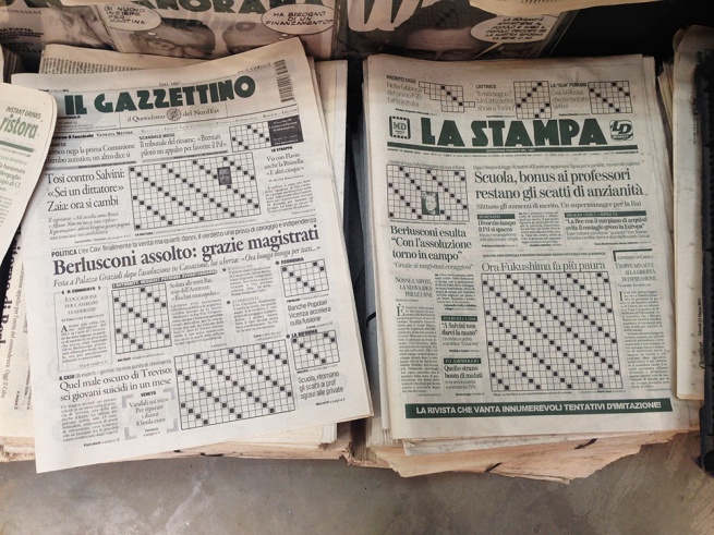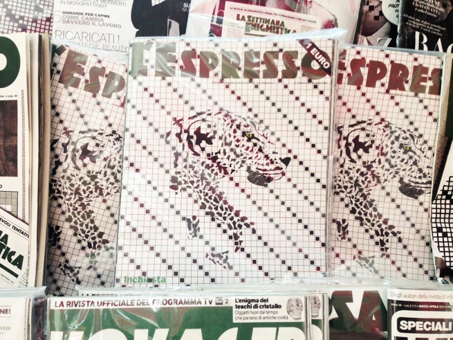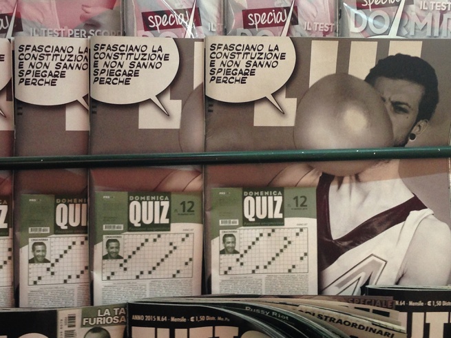 Sono alcuni dei titoli delle copertine di giornali e riviste italiane esposti nell'Edicola Mundo di Francesc Ruiz al Padiglione della Spagna alla Biennale di Venezia 2015. Da subito il lavoro di Ruiz mi sembra importante. A seconda della distanza con cui lo guardo mutano i linguaggi e i messaggi. Da lontano si vedono due edicole di cui una, per soli maggiorenni, coperta da una tenda. Avvicinandosi a quella aperta, l'occhio è colpito dalle locandine e si percepisce una strana onnipresenza di cruciverba. Più da vicino si riconoscono le testate di sempre (l'Espresso, il Corriere della Sera, Grazia tra le altre) ma, come in un sogno, si capisce che non sono veramente loro.