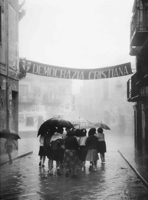 Ecco, è la tensione che precede l’istante fotografico che si respira nelle immagini di Sellerio e, con essa, il lavoro – e il piacere – del fotografare. E se qualche volta questo piacere si concretizza in un’ironia tutta sicula, c’è sempre la sapienza dei grandi maestri. Due immagini per esemplificare. La prima, datata 1955, mostra un fitto gruppo di persone, molte delle quali con un ombrello in mano, al centro di una strada sotto la pioggia. Dietro di loro si intravede una piazza, quella di Polizzi Generosa, un paese in provincia di Palermo. Sulle loro teste invece campeggia uno striscione lungo quanto l’intera strada che riporta la scritta “Democrazia cristiana” preceduta dal celebre scudo crociato. Inutile dire che erano gli anni in cui questo partito politico dominava incontrastato le elezioni, specie in Sicilia, e quel diluvio può quindi voler dire molte cose. Ancora una volta, probabilmente uno scatto atteso, desiderato, cercato. E tuttavia di nuovo reso ancor più interessante da quello che non ci si poteva aspettare: un ombrello che esce fuori dal coro, diretto dalla parte opposta. Al di sotto, a giudicare dai calzoncini corti, un bambino. Punctum bartesiano? Forse i calzoncini, il personaggio non direi proprio: è chiaro che è espressione, per dirla con le parole del semiologo francese, dei miti del fotografo.