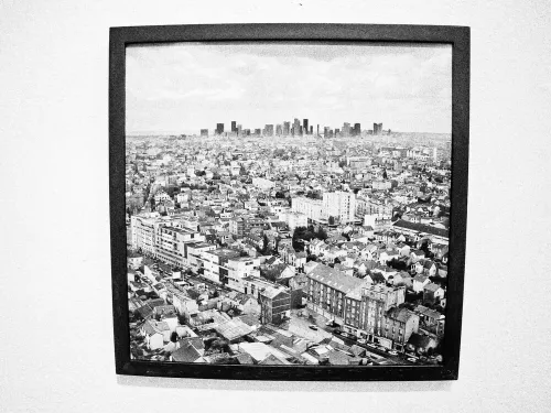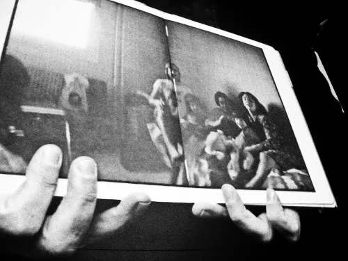 Entrare in una galleria o in un museo per vedere una mostra, fermarsi davanti a un oggetto, distrarsi e poi camminare attraverso le stanze, far scivolare il proprio sguardo da un punto a un altro incrociando gli altri visitatori, soffermarsi anche sui loro movimenti e i loro corpi che ostacolano o interagiscono con la visuale, decifrare la struttura degli spazi e i piccoli contrasti determinati dalle uscite di sicurezza e dai cartelli esplicativi. Con Ti guardo Talos Buccellati tenta di indagare con il solo mezzo fotografico gli imprevisti e le interferenze che segnano lo sguardo durante una visita a un’esposizione.