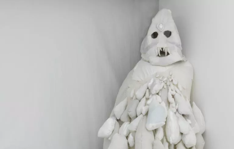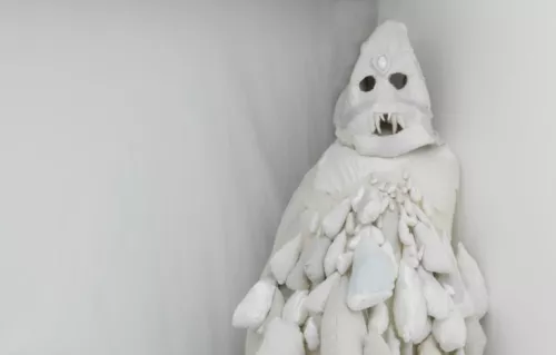 “Ero ancora un piccolo feto nel ventre di mia madre quando le persone paurose cominciarono a chiedere di me: tutti i figli partoriti da mamma fino a quel momento erano di traverso ed erano venuti al mondo morti. Non appena mamma si rese conto di aspettare un bambino, quel bambino che un giorno sarei stato io, disse a coloro che abitavano con lei: “Ora porto di nuovo in grembo un feto che non diventerà una persona”. Chi parla è Aua, lo sciamano della tribù degli Iglulingmiut di Iglulik. Le sue parole sono state raccolte da Knud Rasmussen, esploratore delle zone artiche, all’inizio degli anni Venti del Novecento. Lo sciamano assume su di sé il compito di mediare tra la tribù e gli spiriti che presiedono alle attività venatorie. Per fare questo deve superare una serie di prove iniziatiche. Una delle più importanti consiste nel separarsi dal proprio corpo, liberarsi della carne e vedere lo scheletro al di fuori di sé. Solo così potrà rinascere e ritornare in possesso dell’identità di uomo e salvare chi è malato o in pericolo. Se si guardano i personaggi di stoffa allestiti da Evegeny Antufiev, e in particolare quello assiso in cima a un mucchio di stoffe adagiate in un angolo della stanza, ci si rende conto che chi è qui raffigurato è uno sciamano colto nel momento del passaggio da uno stadio all’altro della sua mutazione, quando il corpo appare privo d’ossatura, qualcosa di molle e d’afflosciato, un fantoccio che somiglia a uno degli spiriti che ha afferrato e trascinato lontano dal malato che sta curando. Dal suo corpo, incerto tra il maschile e il femminile, pendono sacche simili a seni come se si trattasse di Artemide Efesia.