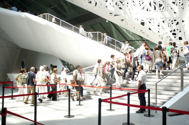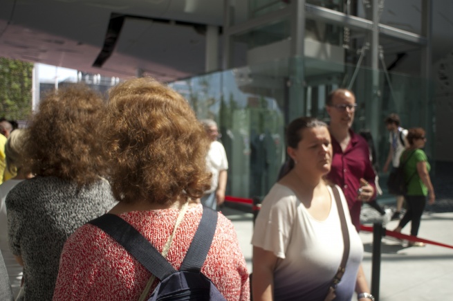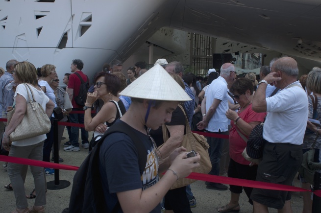 Expo è intrattenimento, quindi te lo devi pagare. Allora si sta in coda, si suda in mezzo agli altri ad aspettare senza insofferenze, chiacchierando e curiosando nei discorsi degli altri. È movimento, per non ammuffire; un gioco, l’uomo ha bisogno di giocare. Non ho visto intellettuali, bensì umanità divertita in barba al pianeta!