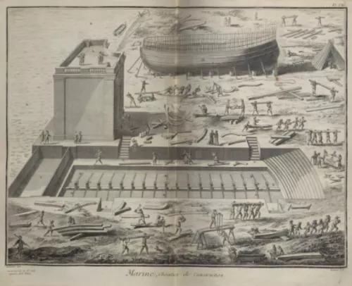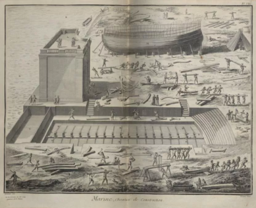 Per millenni il legno è stata la materia insostituibile delle navi, e lo sarà ancora fino a tutto il Settecento. Quando i redattori dell'Encyclopédie di Diderot e D'Alembert affrontano il tema della marineria, scelgono di inserire la tavola con la veduta di un cantiere navale (Planches, VII, 1765).