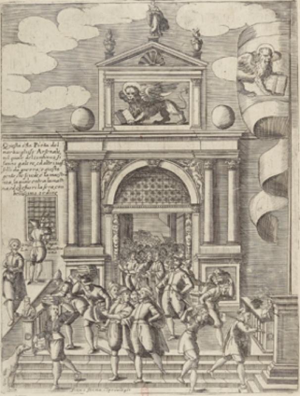 L’incisione contiene una sorta di lunga didascalia: “Questa è la porta del maraviglioso Arsenale, nel quale del continuo si fanno galere, ed altri vasselli da guerra, e questa gente che si vede è la maestranza, la quale entra la mattina ed esce fuori la sera, con bellissimo ordine”.