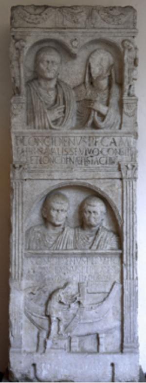Eccone una su un monumento funerario della prima metà del I secolo d. C. a Ravenna. È una grande stele in pietra con quattro ritratti a mezzo busto: sopra, quello di Publio Longidieno, che l’iscrizione latina identifica come faber navalis; accanto a lui una liberta (con ogni probabilità la moglie), e sotto altri due suoi ex-schiavi.