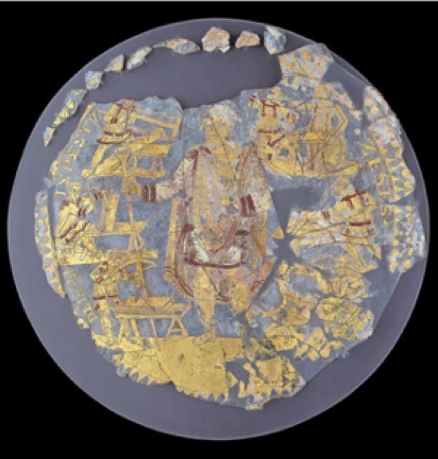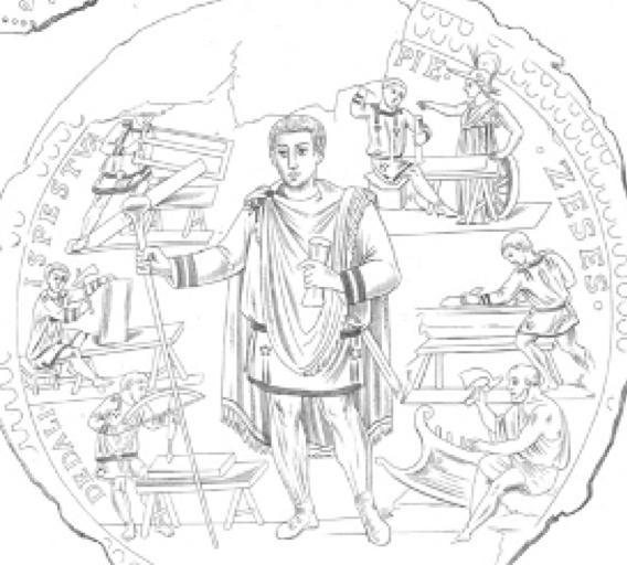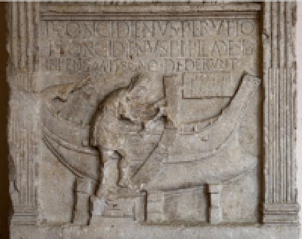 Alcuni secoli dopo, vediamo altri carpentieri navali in un oggetto dei Musei Vaticani, un prodotto di lusso eseguito con una tecnica diffusa nel mondo romano tra III e IV secolo d. C., il vetro dorato. Un personaggio che l’iscrizione identifica come Dedalius è in piedi al centro del vetro, circondato da sei operai impegnati in differenti occupazioni. Anche questo è un cantiere navale, come si deduce dal profilo di imbarcazione in basso a sinistra, e tutti stanno sagomando assi di legno con pialle, trapani ad arco, scalpelli e martelli, seghe e asce. Dedalius, nome che riecheggia quello del mitico artista Dedalo, ha un ruolo di comando e molto probabilmente è un militare: lo suggeriscono gli abiti, la spada che pende dal fianco sinistro, lo stesso bastone (vitis) nella destra.