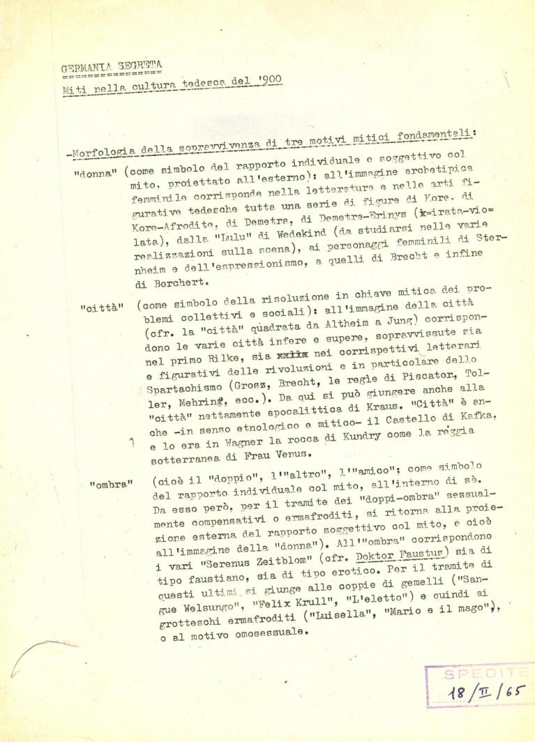 Germania segreta segna un passaggio importante nell’itinerario intellettuale di Jesi. Nei primi dieci anni della sua precocissima attività, cominciata quando era ancora un puer con un libro sulle leggende di Roma antica pubblicato insieme alla madre, Jesi si occupò soprattutto di archeologia, di storia delle religioni antiche e di etnologia, subendo l’influenza degli autori che aveva letto nella celebre “Collana viola” di Einaudi: Jung, Frobenius, Pettazzoni, Propp, lo stesso Kerényi (i contributi storico-religiosi di Jesi sono stati raccolti da Giulio Schiavoni in La “Ceramica egiziana” e altri scritti sull’Egitto e la Grecia (1956-1973), Aragno, Torino 2009). A partire dalla metà degli anni ’60 i suoi interessi si orientarono sempre più verso le sopravvivenze del mito nella cultura moderna, in particolare in quella del mondo mitteleuropeo. Il primo risultato di queste ricerche fu proprio Germania segreta il più kerényiano dei suoi libri anche nella scelta dei miti analizzati: la fanciulla divina, kore, la città, la morte. Il libro uscì nel 1967 per i tipi dell’editore Silva all’interno di una collana progettata e diretta dallo stesso Jesi che doveva riunire testi e studi attorno al tema del mito e del simbolo nella Germania moderna. Il programma di questa collana redatto da Jesi è riportato nell’utile Appendice al volume che raccoglie anche abbozzi, alcuni destinati a confluire, talvolta profondamente rimaneggiati, nel libro, altri esclusi e riutilizzati dall’autore in lavori successivi.