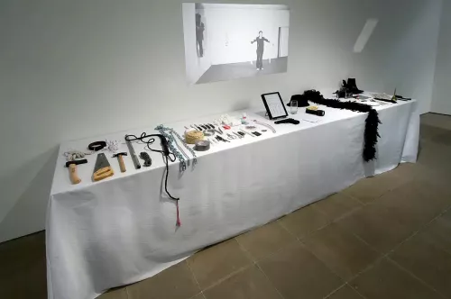 A Napoli, presso lo Studio Morra, l’artista serba si lascia manipolare dal pubblico, invitandolo a utilizzare – infierendo pure sul suo corpo – alcuni oggetti disposti sopra un tavolo: uno scalpello, una bottiglia di vino, un giornale, una frusta, una mela e una pistola.