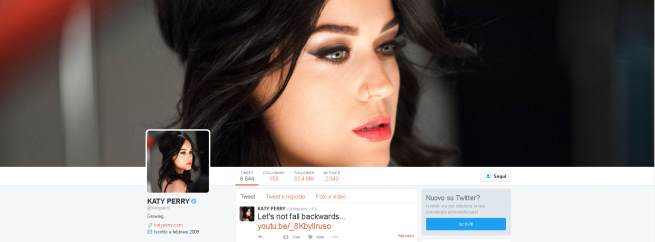 Dall'italiano più seguito ritorniamo alla più seguita al mondo, Katy Perry, che non si spreca più di tanto con le immagini dato che profilo e header sono uguali, l'importante è avere un'espressione ispirata. Poi c'è chi è un brand, come Ellen DeGeneres che utilizza come foto del profilo il logo del programma, piazzandosi in copertina, a figura intera, vicino al numero delle stagioni raggiunte dal programma.