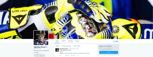 Dalla politica passiamo allo sport, in cui vediamo l'italiano più seguito al mondo, Valentino Rossi, presentarsi in maniera corretta e coerente: ci dice che è un pilota da corsa con il numero 46 e utilizza due belle foto. L'immagine profilo lo vede in primo piano col ghigno che lo contraddistingue, mentre in copertina si evidenzia un dettaglio della vestizione da corsa, quella dei guanti, con tanto di sponsor in bella vista.