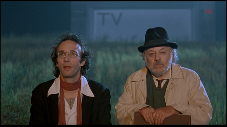 Anzi, rivedendo in questi giorni La voce della luna, più che dagli apoftegmi contro il fracasso della contemporaneità («Se tutti facessimo un po’ di silenzio, forse qualcosa potremmo capire»), rimango colpito semmai da quei personaggi in cui Fellini raffigura pezzi di se stesso: l’oboista Sim, che si è rifugiato in un loculo del camposanto per difendersi dalla musica (dal cinema?) «che promette, promette, e non mantiene mai»; l’ex prefetto paranoico Paolo Villaggio, ossessionato dall’idea che i vicini lo possano contagiare con «la loro orrenda malattia: la vecchiezza»; il folle disincarnato Roberto Benigni, “abitato” da una cacofonia di «schiocchi di frusta» e «migliaia e migliaia di voci» che non è (più?) in grado di decifrare.