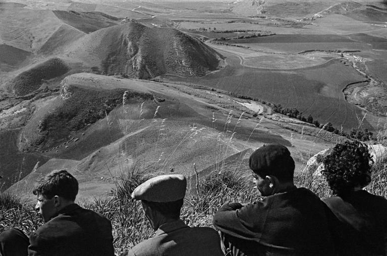 Uno sguardo che si lancia oltre la cabina di guida di un treno regionale siciliano diretto chissà dove, comunque, sicuramente, lontano. Sembrano saperlo i quattro uomini di spalle, seduti al sole (un incauto è senza berretto, due portano la coppola, uno è protetto dalla chioma medusea) su un'altura che domina Roccamena; pur nella ruvidità della resa, sembra davvero un locus amoenus, bucolico passaggio del Belice.