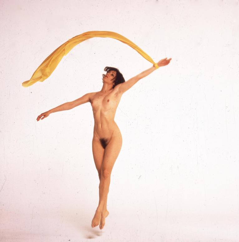 “Forme movimento colore” è uno di questi esiti. La protagonista delle immagini esposte nel 1989 è Valeria Magli, che Carla ritrae più volte negli anni Ottanta. Il corpo nudo e scattante è fotografato mentre salta, volteggia, compie passi di danza, tenendo in mano diversi lembi di stoffe, anch’essi in movimento (tre di queste immagini si possono vedere in mostra). “L’idea di queste fotografie mi è nata vedendo Valeria Magli, danzatrice e coreografa, ospite per una sera, entrare nella cabina doccia della mia casa al mare. Il corpo morbido e forte, chiaro, si stagliava sul nitore delle maioliche. Mi colpì il movimento, l’introdursi leggero, bianco su bianco”, racconta Carla Cerati.