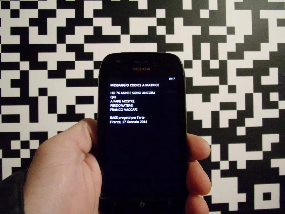 Dal processo chimico e materiale a quello digitale ed effimero, come si trasforma allora il rapporto tra spettatore, mezzo tecnologico e fotografia? Oggi Vaccari ci mette davanti dei codici e ci invita ancora a scattare. Questa volta però non sulla nostra immagine (siamo già noi ad occuparcene abbastanza), ma su quella criptata che l'artista ha dato di sé. Intraducibile dall'occhio umano, dobbiamo fare ricorso a quello meccanico. Inquadrare. Scattare. Leggere. Il ritratto in realtà non è iconico, ma testuale: “Ho 76 anni e sono ancora qui a fare mostre. Perdonatemi. Franco Vaccari. BASE progetti per l'arte, Firenze 17 gennaio 2014.”