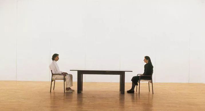 Ulay lo descrive così: “Un uomo e una donna, seduti a lati opposti di un tavolo, immobili, in silenzio. Ecco tutto”. La performance è il risultato di una serie di viaggi intorno al mondo, nuovi interessi, filosofie, e approcci alla vita. Dopo anni di esplorazione estrema di movimento, suono, e forza fisica, con Nightsea Crossing, si interrogano se la sola presenza fisica, il loro “essere con il pubblico” sia sufficiente perché si possa parlare di performance. Si tratta di un tentativo di ridurre tutto (il loro lavoro di performers, ma anche l’esperienza umana) ai minimi termini. E di mettere a confronto occidente e oriente. All’origine di questo lavoro, è un loro viaggio in Australia 1980.  “Ci trovammo da soli nel Central Australian Desert con temperature che raggiungevano i 48 gradi. A quelle temperature l’immobilità è quasi obbligata. Guardare un rettile che respira è uno spettacolo e forse il massimo che puoi fare.  Con quel caldo puoi solo vegetare, come una pianta. Prima di muoverti, ti chiedi dieci volte se ne vale la pena. Vivere in quelle circostanze ci ha fatto pensare in maniera del tutto nuova a cos’è il movimento, l’azione e direi la vita. Ti costringe a economizzare le energie ed eliminare qualunque cosa superflua. Dall’altra parte ti fa scoprire la bellezza e il mistero dell’essere. Cosa vuol dire semplicemente essere”.