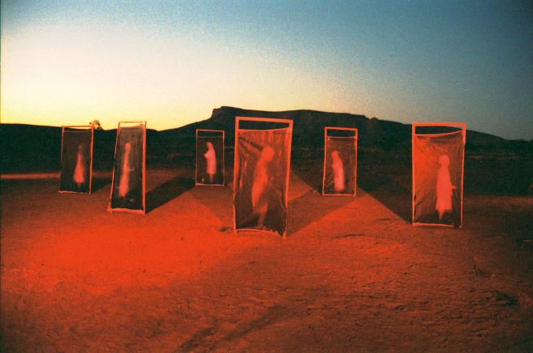 La sfida di creare immagini fotografiche che non rimpiccioliscano il soggetto ha accompagnato Ulay in diversi momenti, con o senza l’ausilio della grande Polaroid. Durante un suo soggiorno tra gli aborigeni Pitjantiatjara nel deserto nel sud dell’Australia, Ulay sviluppa l’idea che chiamerà afterimages. Di notte, alla luce tenue di un fuoco, fissa nel terreno, come delle porte, delle cornici di legno di 1.80cm X 70cm, e le ricopre di carta fotografica. Chiede agli aborigeni di danzare uno per volta davanti a queste “porte”. Durante la danza aziona un flash che imprime abbastanza luce per cogliere una traccia del corpo danzante sulla carta fotografica, poi trattata con un fissativo. Il risultato sono “presenze” fantasmagoriche, appunto afterimages.