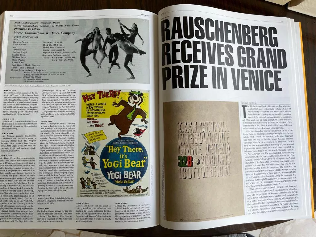 New York 1962-1964 (NY 62-64), apparso in occasione della omonima mostra visibile allo Jewish Museum di NY fino al prossimo gennaio, è un volume fruibile per sé. Rappresenta un tributo postumo a Germano Celant, il quale lo aveva ideato e stava curando prima della sua scomparsa nel 2020. In termini di formato e grafica, ricalca volutamente quelli di Life magazine, la arcipopolare rivista americana che si distinse (dagli anni Trenta agli inizi dei Settanta) grazie alla sua attenzione alla fotografia, impaginando con perizia una quantità di superbe immagini vuoi di reclame di prodotti di ogni tipo vuoi di notizie avvincenti. Seguendo questa falsariga, NY 62-64 narra, e soprattutto illustra, un repertorio di fatti che riguardano il triennio tra gennaio 1962 e dicembre 1964, e includono dalla crisi dei missili a Cuba al suicidio di Marylin Monroe, dall’apertura del terminale TWA progettato da Eero Saarinen all’assassinio di John F. Kennedy, dalla carismatica figura di Martin Luther King alle mutazioni del gusto e della moda, dall’uscita del film Dr. Strangelove di Stanley Kubrick alle rivendicazioni di diritti civili che nei decenni successivi verrà confermata dalla fervente multiculturalità newyorkese. Naturalmente, però, larga parte del libro è un rendiconto delle vicende artistiche di quei tre anni: l’avvento della Pop Art e il crescente prestigio di artisti quali Allan Kaprow, Claes Oldenburg, Simone Forti, Jasper Johns e Andy Wahrol.