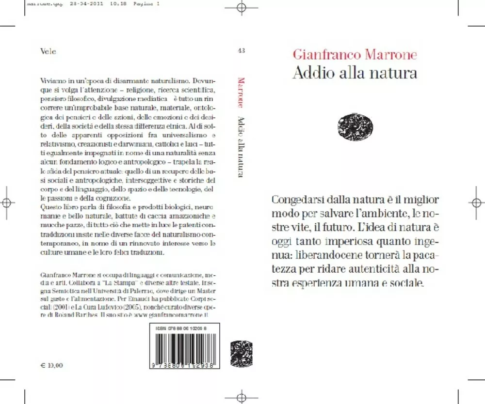 Marrone definisce il packaging ecologico dei sacchetti, delle etichette, frasi e disegni, una “retorica dell’ipocrisia” che nasce non tanto e non solo dalle tecniche di vendita del Capitale, quanto piuttosto da un’idea errata di Natura. Per liberarci da un ecologismo di maniera, oggi del tutto fagocitato dal marketing, bisogna partire da un’idea di fondo: Bye bye Natura! La Cultura, come ci ha insegnato Lévi-Strauss con le sue permanenze presso le tribù amazzoniche, negli anni Trenta del XX secolo, ha completamente inglobato la Natura, l’ha trasformata in qualcosa d’altro.
