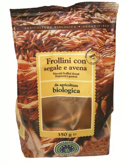 Due sacchetti di biscotti biologici. Sono frollini. Sulla confezione di carta del primo c’è l’immagine dei biscotti contenuti in un vasetto di vetro, come si usava un tempo; sul secondo, invece, le immagini rendono conto del ciclo ideale del biscotto: dalle materie prime, i chicchi di segale e i fiocchi d’avena, alla farina sino ad arrivare ai biscotti stessi. Il primo prodotto ecologico punta sulla conservazione ideale del biscotto, il secondo sugli ingredienti naturali di cui è composto; nella banda superiore del sacchetto c’è scritto: Agricoltura biologica-Organic.