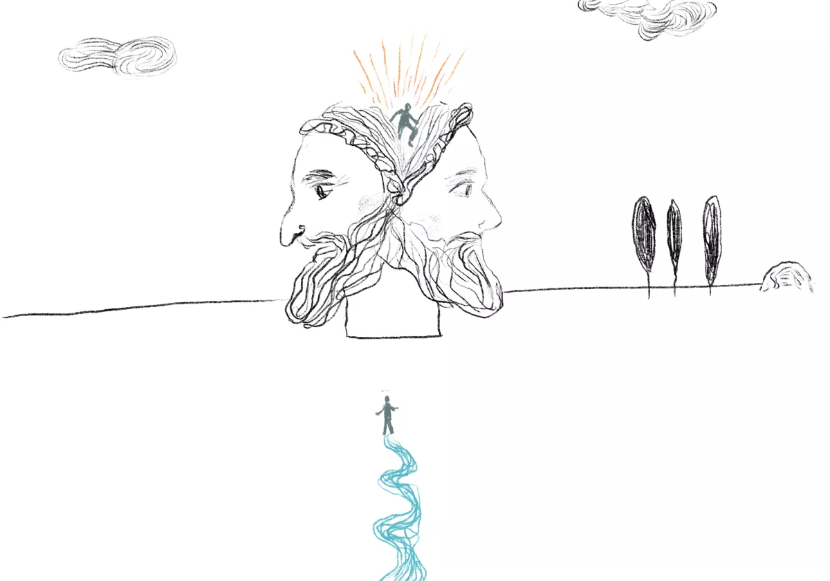 Osservando la raffigurazione tipica di Giano, sembra generarsi uno spazio lì dove le sue due teste si fondono. Lo vediamo comparire nella zona dei capelli.