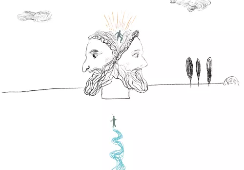 Riducendo poi il profilo di Giano a un diagramma essenziale, compariranno due forme semplici, fuse insieme, più una terza che, come un cuneo, cerca di dividerle, le divarica, si insinua per aprire una breccia. È proprio qui che dobbiamo esercitare il potere che ci viene offerto in questi giorni di sospensione, espandere il nostro spazio mentale per generare delle possibilità, vedere ciò che non avevamo visto per fretta, per noncuranza o disattenzione.