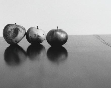 La foto in copertina, di Sabrina Ragucci, mostra tre mele appoggiate su un piano. Non sono freschissime; una anzi – la prima da sinistra – mostra pronunciati i segni del tempo. Ma il modo in cui sono riprese – il bianco e nero, lo sfumato dei contorni, l’ombra incerta sul piano – è proprio da una collocazione precisa nel tempo che le allontana.
