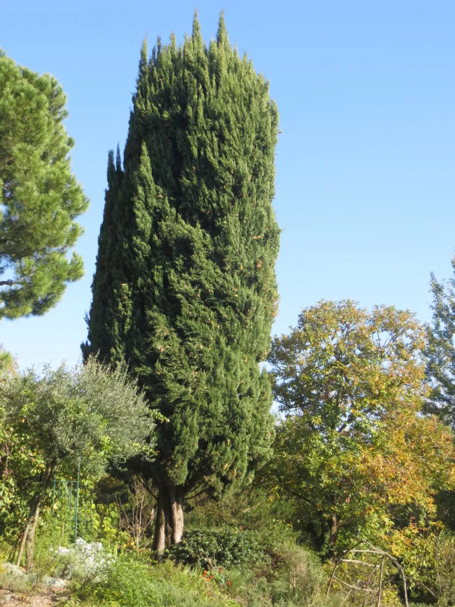 Albero originario della Grecia e delle isole mediterranee quali Creta e Cipro (da qui una delle ipotesi onomastiche), fu introdotto in Italia dagli Etruschi, se non addirittura dai Fenici, per divenire nei secoli araldo del paesaggio umbro-toscano. Ma – ahinoi – anche in Lombardia non c’è cascinale, borgo o poggio che non abbia in dotazione le sue guglie verdi fin troppo curate. È pianta monoica, con fiori unisessuali ma presenti sullo stesso esemplare: facile perciò distinguere in stagione i coni femminili tondeggianti, che a maturità evolvono in strobili sferici a squame poligonali, dai minuscoli coni maschili posti all’apice dei ramuli, giallastri al momento del rilascio del polline.