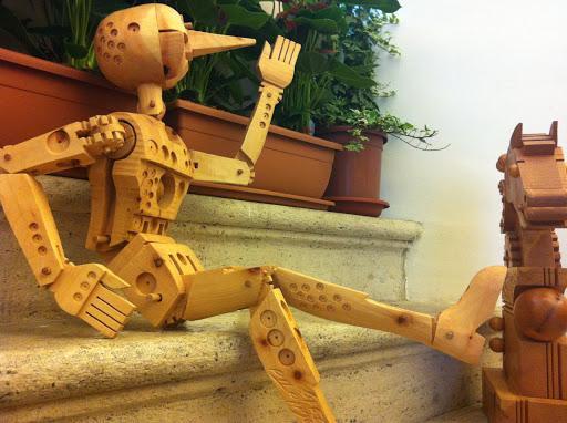 Il protagonista, allora, si fa «boscaiolo di voci. Con secchi colpi d’ascia abbatto questo tronco sibilante». Profezia: «Giorno verrà in cui il silenzio sarà un unico corpo sacro da venerare, in cui il rispetto del prossimo passerà per l’amore di questo pane della comunione, la sola ostia della nostra vita civile. E chi farà rumore, chiunque non richiesto imporrà agli altri la propria presenza, sarà il capro espiatorio dell’intera tribù. Ma non verrà condannato a essere recluso, né mutilato o ucciso. Al contrario, il suo udito sarà soltanto acuito oltre misura, perché possa partecipare più intimamente alla natura del senso violato. Lo si costringerà ad ascoltare». L’ascolto è sempre un po’ una costrizione, e Pinocchio lo sapeva bene. Accanto ai molteplici Pinocchi di Dine, si diceva inizialmente, ve n’è uno meno noto in Piazza Esedra, all’interno del MusEd, Museo della Scuola e dell’Educazione che ha appena inaugurato una nuova ala espositiva. Il Pinocchio di Ferdinando Codognotto è intimamente legato a quello di Dine, spazialmente e specialmente: è stato in mostra nelle stesse sale di Palazzo delle Esposizioni nel 1982 ed è della stessa specie, di legno, in quanto anche per Codognotto «il legno è il materiale più vicino all’uomo». Sculture da auscultare, sentire scolpiti.  “L’albero di Pinocchio” impiega la molteplicità del burattino che è molteplici bambini, assume forme diverse, è difforme. Non è l’albero della cuccagna quello a cui il Pinocchio di Codognotto è legato: è la macchina che fa partire le storie, che racconta. Tiene il burattino per la “collottola”, come Geppetto al principio della storia. Come Geppetto, l’albero tecnologico non sente, ascolta. Una storia è sempre noi che ascoltiamo una storia: noi gli orecchi, i nostri Pinocchi corpi che vanno a sentire, ad auscultare.