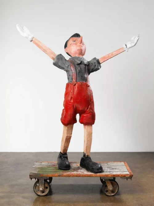 In tempi duri per gli umani, piovono burattini. Roma è invasa da Pinocchi. Pinocchi rinchiusi, Pinocchi che non ascoltano e, pertanto, si moltiplicano. I Pinocchi di Jim Dine, ad esempio: 11. Il Pinocchio di Codognotto al Mused (Museo della Scuola e dell’Educazione dell’Università Roma Tre), a pochi passi dalla mostra dell’artista statunitense a Palazzo delle Esposizioni. In un luogo ancora troppo poco conosciuto, eppure pubblico: in entrambi i casi uno spazio museale. I Pinocchi di Jim Dine sono come incantati: non inermi, ma fissati nell’atto di dire qualcosa, di dare qualcosa. Sulle pareti dell’ala in cui sono esposti Jim Dine ha anche dipinto alcune sue poesie: scriverle a caratteri cubitali ha sempre significato per lui l’opportunità, in quanto dislessico, di superare la difficoltà di lettura e, in qualche modo, anche di creazione. In fondo a destra c’è un Pinocchio con una sega: è legato a una struttura metallica per la testa. Forse l’artista intende fermare il creato che si fa creatore? Dine ha dichiarato: «L’idea di un pezzo di legno che parla e che diventa un ragazzo in carne e ossa è una metafora dell’arte». Accanto a un Pinocchio tanto ardito Dine dipinge questi versi: