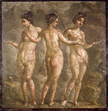 Le tre Grazie, frammento di decorazione parietale in casa di Titus a Pompei, età neroniana (58-64 d.C.). Museo Archeologico Nazionale, Napoli