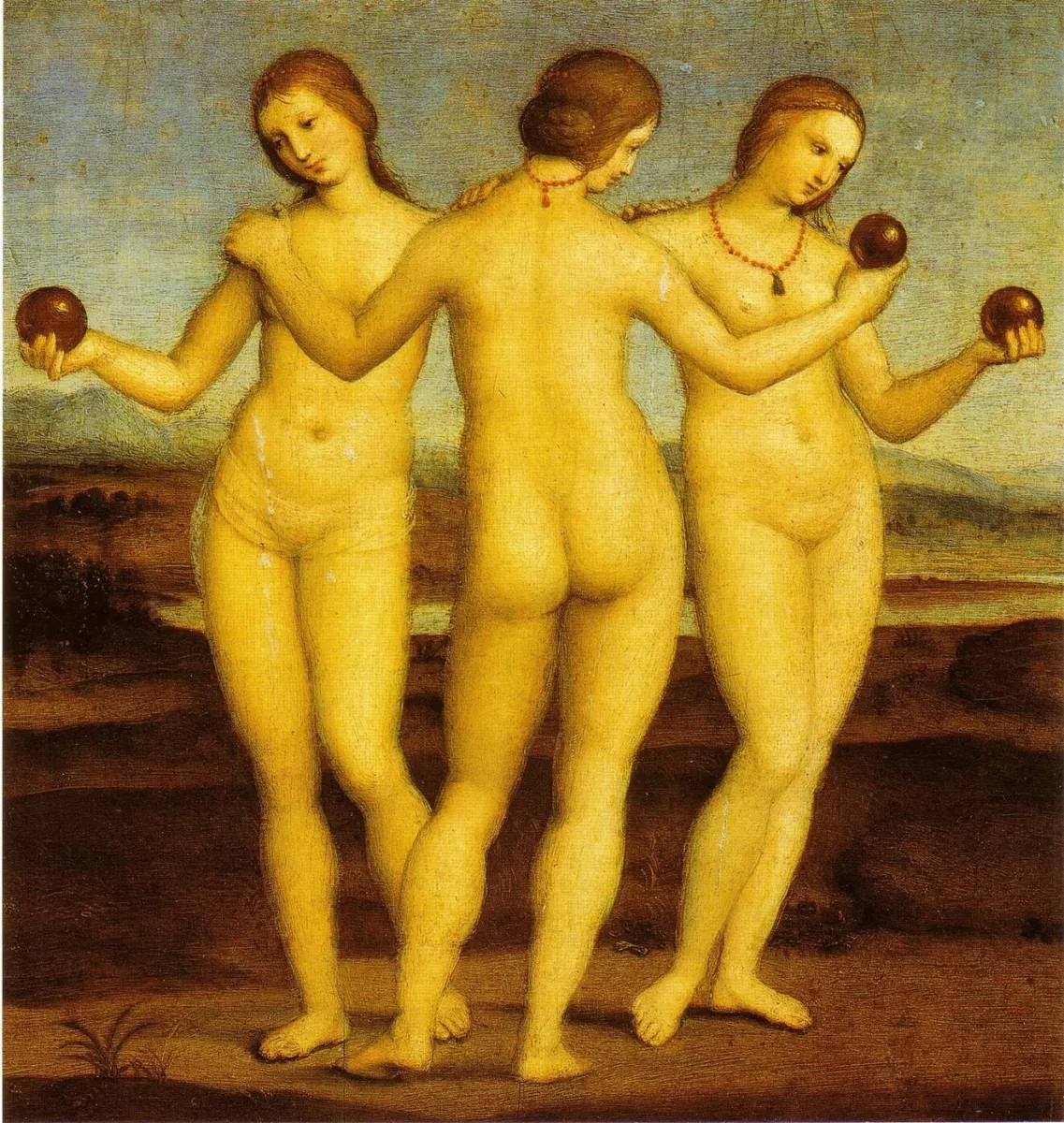Splendore, sì, certo, lo splendore che sta nel nome di una delle Grazie (Aglaia, la splendente). Le tre Grazie si muovono in una danza circolare, scambiandosi doni che danno piacere. Questa è l'immagine delle Grazie dell’arte ellenistica e romana, copiata dagli artisti del Rinascimento: tre figure femminili che si muovono in cerchio con le braccia intrecciate e doni nelle mani. Fanciulle vergini, perché pure e non corrotte dal dono.