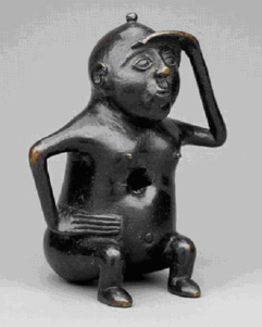 A quanto pare queste piccole sculture in bronzo venivano riempite d’acqua e poste accanto al fuoco per fare in modo che l’acqua venisse soffiata fuori attraverso fori praticati appositamente; seduti o inginocchiati a terra, talvolta con un apparato sessuale ben evidente, tengono una mano proprio sulla fronte. In altre parole, hanno forme e carattere piuttosto simili a quelli dei satiri greci: forse è proprio il desiderio di conservare – in questa sorta di automi alla buona – volgarità e istintività dei satiri, che trascina con sé il gesto dello stupore improvviso di quelle mitiche creature semiferine.