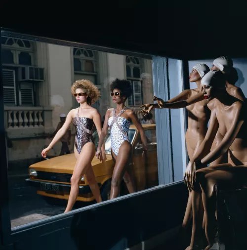 E ai surrealisti, amanti del gioco ambiguo tra donne e manichini, tra umano e artificiale, farà appunto riferimento una sua immagine del 1984 per Vogue Paris, rivista con cui collaborerà moltissimo. Dentro una vetrina vediamo un gruppo di bellissime donne-manichino, “nude” ma con tanto di rossetto e cuffie da nuoto, come intente a osservare incuriosite due splendide ragazze che, indifferenti di tutto, camminano trionfanti per strada in costume da bagno. Con questa foto Guy Bourdin rovescia in un solo scatto la logica abituale tra chi guarda e chi è guardato. Qui sono infatti le spoglie donne-manichino a “guardare” invidiose e malinconiche le due modelle un po’ cyborg, dotate, loro sì, di seducenti costumi da bagno e capaci di camminare a passo trionfale, incuranti degli sguardi altrui e delle vetrine che avrebbero dovuto catturare la loro attenzione.