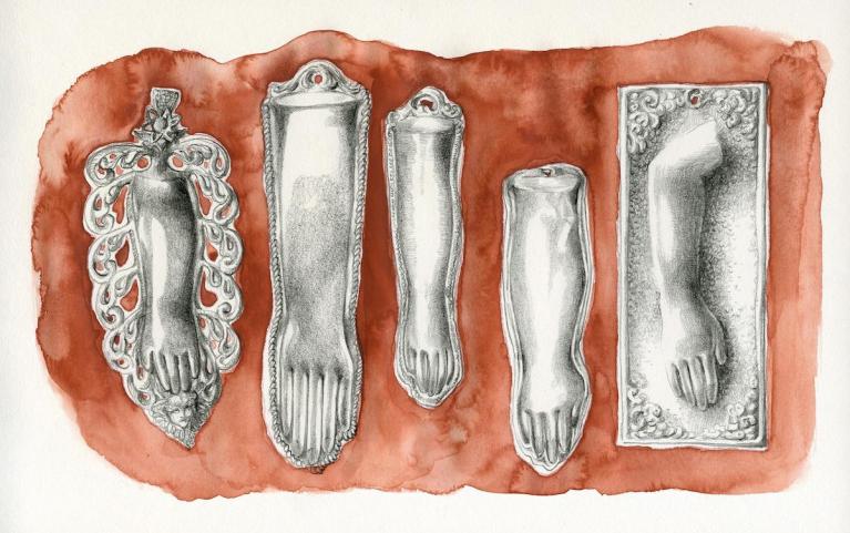 Per una bambina erano impressionanti anche gli ex voto nei santuari, dai più poveri in legno che le mie memorie infantili collocano a Gemona e Castelmonte a quelli in argento, un po’ “barocchetti”, presenti nel centro Italia e a Napoli, che ne è tanto ricca he credo abbiano tenuto gli stampi che continuano a sfruttare per gli amanti dei mercatini dell’antiquariato.