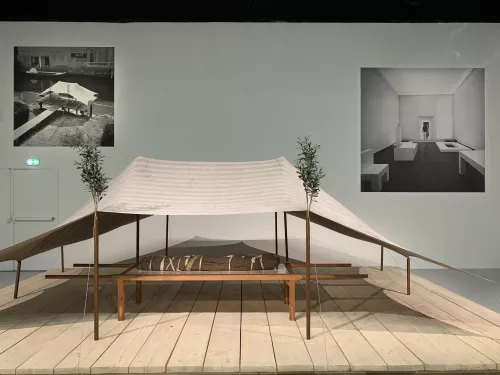 All'interno del padiglione austriaco progettato da Joseph Hoffmann, Hollein colloca sedie e tavoli rivestiti di piastrelle quadrate di ceramica bianca che conferiscono uniformità e un senso asettico allo spazio, rappresentazione del funzionalismo. All'esterno, lungo il perimetro dei Giardini della Biennale, si snoda un percorso che conduce a una tenda sotto la quale è posizionata una barella con una silhouette avvolta nel sudario, simboli del trapasso alla morte. In anni recenti Daniel Tudor Munteanu e Davide Tommaso Ferrando riprenderanno la poetica di Hans Hollein nel loro Unfolding Pavilion, un atteggiamento radicale nel contestare le modalità della biennale ufficiale. La mostra parigina si conclude con i progetti realizzati, sui quali spiccano il museo di Francoforte con la sua forma triangolare monomaterica e la Hass Haus a Vienna, emblema della rottura della superficie muraria con l'innesto di una superficie vetrata che si trasforma in volume cilindrico vetrato.
