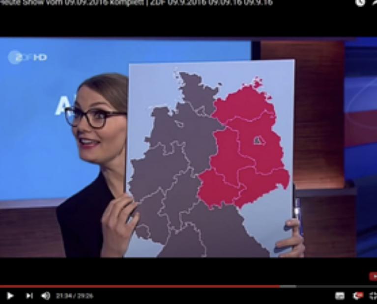 Incatenati ai loro fantasmi, questi manifestanti e i rappresentati dei partiti di estrema destra sono stati i protagonisti mediatici della stagione seguita al fallimento, almeno parziale, della cultura dell’accoglienza. I confini temporaneamente aperti verso l’esterno hanno riconfermato quelli interni, producendo una lacerazione nazionale. Nel più noto programma satirico della televisione di stato, dopo le ultime elezioni si critica il partito di Merkel, la CDU, perché ha voluto aprire a tutti i costi le frontiere e si chiede alla cancelliera di ammettere finalmente: “Nel 1989 abbiamo fatto un grande errore”. Infine si propone di consegnare a quelli che vogliono ‘ Una Germania solo per tedeschi’ quei Länder in cui le destre razziste e xenofobe sono più forti. Fatti i conti, ne risulta una cartina con una rinata Repubblica democratica, ribattezzata DDR nel senso di ‘Germania delle Destre’ (Deutschland Der Rechte,).