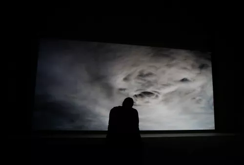 C’è un tempo scandito da questo “altro sole”, per fare in modo che il pubblico si possa muovere in uno spazio che pare seguire il ritmo delle rivoluzioni dei pianeti in un sistema solare. Continua a muovere qualcosa, spostando l’attenzione dei fruitori ora sulle proiezioni di quattro film o sulle ombre delle diciannove Marquees (riprese dai tabelloni luminosi che negli anni ’50 riportavano il programma di un cinema all’esterno, annunciando regista e attori, e qui diventate segnalatrici del vuoto che rimanda solo a se stesso) nella lunga parete bianca, ora su un’esecuzione del pianista Mikhail Rudy, sulla musica proveniente da due pianoforti Disklavier, che determinano la sequenza temporale di tutta l’esposizione, e sembrano suonare da soli o da fantasmi, ora su un brano di elettronica dance o sullo scorrere del sintonizzatore tra le voci e canzoni delle radio. Le forme appaiono, scompaiono per poi riapparire di nuovo, in loop, cangianti o in bianco e nero, tra silenzi e suoni del quotidiano. È una mostra percorsa da presenze ultrasottili, ectoplasmatiche, dove vite precedenti e attuali convivono allo stesso tempo. I linguaggi sono molteplici, attingono alle soluzioni formali della scultura cinetica, all’interdisciplinarità delle neoavanguardie americane, al cinema sperimentale strutturale, all’arte concettuale, alle pratiche “relazionali”. È messo in visione il riuso di opere del passato, che assumono una forma nuova. Siamo portati entro una mostra sinfonica e corale, non determinata nel tempo. Non solo lo spazio, ma anche le immagini sono in costante divenire, senza un inizio o una fine, in grado di favorire associazioni molteplici e non definibili a priori: “Oggi non esistono più belle immagini, ma piuttosto catene di immagini. […] Con “catena” intendo una struttura dinamica che produce forme; pre-produzione, produzione, post-produzione: queste istanze narrative dipendono l’una dall’altra”. Anche i quattro film scandiscono una concatenazione di immagini collegate, dove aleggiano presenze fantasmatiche, mostri dell’oscurità infantile, masse in stato d’ipnosi, rimandi extraterrestri. The Boy From Mars (2003), cortometraggio girato nel villaggio di Sanpatong in Tailandia, ripercorre i cambiamenti di intensità luminosa emanata dalla Battery House ideata dall’architetto François Roche, ovvero una sorta di shed che genera energia elettrica mediante un sistema di pulegge, attivato dalla forza di alcuni bufali da tiro, e si sofferma su presenze luminose nel cielo, lasciando il dubbio che siano presenti navicelle spaziali o lanterne infuocate che ascendono nella notte. In Invisibleboy (2010-2015), un bambino cinese immigrato a New York, probabilmente non documentato da un censimento giuridico, è immerso in una moltitudine soffocante di oggetti che si accumulano negli spazi angusti di un piccolo appartamento. Il bambino immagina o vede esseri mostruosi aggirarsi tra le stanze e nelle vie di Chinatown, quasi fossero presenze aliene o figure invisibili come lui. In Marilyn (2012) il fantasma della Monroe si muove nella suite dell’hotel Astoria di New York, ancora, come fosse negli anni Cinquanta. In realtà tutto è finzione, girata in in un set cinematografico vuoto, dove la sua voce è un algoritmo, il suo sguardo è la macchina da presa, e la sua scrittura è riprodotta da un robot. Nel rinnovato The Crowd (2015) centinaia di persone sono radunate attorno a un’area luminosa, forse attirate dal suono di un pianoforte. L’esecutore non si vede. I passaggi dei corpi in movimento paiono divenire ombre, entrare in nubi di particelle sospese o in masse di fumo, evocando fantasmagorie, come se gli individui fossero stati proiettati in un’esperienza forse ultraterrena. Questi cortometraggi insinuano la sensazione che i confini tra presenza e assenza siano evanescenti, come pure quelli tra chi osserva e chi è osservato, nel passaggio sottile tra l’impalpabilità della luce e il mondo delle ombre. E da buona opera aperta questa mostra sinfonica continua a muoversi nella memoria di chi l’ha vissuta, lasciando sedimentare e vibrare i suoi impulsi e le innumerevoli suggestioni visive e sonore, in attesa che riverberino nella coscienza sotto forma di altre possibilità immaginali, per “sapere andare oltre le forze esistenti della vita con un istinto ritmico”.