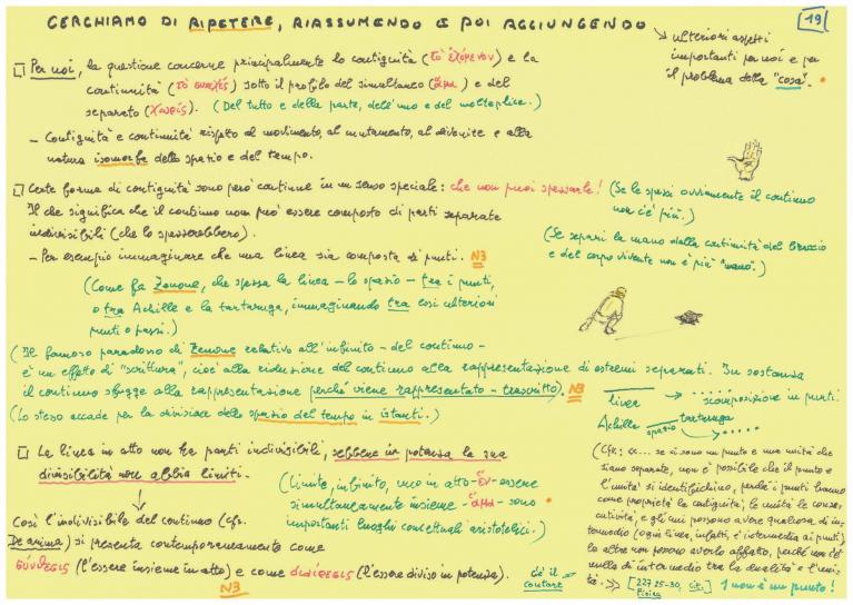 Con tavole (a colori) di Carlo Sini: ecco dunque enunciata la loro specificità, nient’affatto insolita per chi ha avuto il privilegio di seguire nel corso degli anni il lavoro di Sini, ma spiazzante per il lettore medio di cose filosofiche che, se è familiare all’uso in filosofia di diagrammi, schemi o grafi esplicativi, non lo è alla miniatura di Galileo che guarda estasiato nel cannocchiale o al disegno, da sussidiario infantile, di sobri coniglietti copulanti posto a margine di una impegnativa discussione sulla differenza tra contiguo e continuo in Aristotele. La rubricazione complessiva dei materiali nella formula “Mappe del pensiero” può far pensare a una illustrazione a scopo didattico del testo “tradizionale” che nei volumi collettanei in questione precede i cartigli di Sini, ma credo che si commetterebbe così lo stesso errore di chi intende la grande iconografia religiosa come una volgarizzazione del testo sacro ad uso degli analfabeti che affollavano le Chiese. Sappiamo invece che essa era purissima teologia “figurale”. Non illustrava una tesi, ma mostrava all’opera la potenza di Dio, forte di una “evidenza” che il sapere concettuale, la ratio della fides, non poteva avere. Lo stesso credo si debba dire per questi “cartigli”. Essi certamente “mappano” il pensiero. In un certo senso “raccontano” la storia della filosofia e, più in generale, la storia del sapere umano.