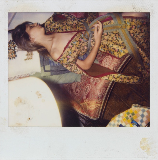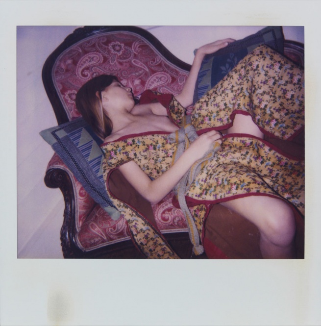 Quanto segue è sconvolgente: “Poiché purtroppo non vedo più in modo abbastanza distinto per disegnare, realizzo i miei ‘schizzi’ con l’aiuto di una polaroid”. Fu così che ogni mercoledì pomeriggio Balthus riceve la visita di una giovane fanciulla, Anna Wahli, che posa per lui tra gli otto e i sedici anni, in una delle 45 stanze dello chalet. In un’atmosfera fuori dal tempo in cui ricorrono gli stessi elementi (stanza, tendone, mobilio, finestra, paesaggio montano), anche gli scatti finiscono per somigliarsi. A cambiare è appena l’angolo di un gomito o di un ginocchio della modella e il fatto che, con lo sbocciare dell’adolescenza, Anna si adagia su una chaise longue e, dalle ampie vesti dai motivi decorativi, saltano fuori le curve del suo corpo. La successione delle fotografie mette a nudo anche il modo di lavorare di Balthus. L’obiettivo – protesi meccanica del suo occhio, della sua mano e del suo pennello – gli permette di cogliere quel momento in cui la realtà coincide con la sua idea mentale e che sarà trasposto sulla tela.