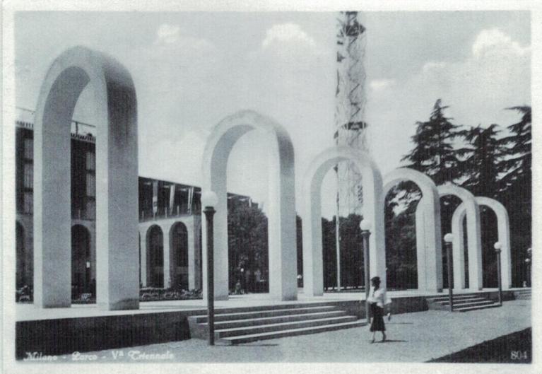 Cartolina fotografica degli Archi ornamentali del Piazzale d'onore, V Triennale di Milano 1933.
