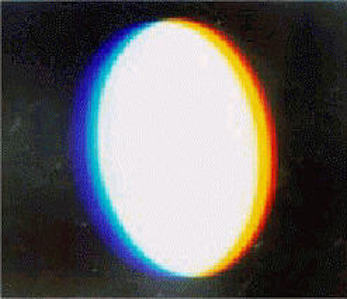 COLORI FISICI – I colori che Goethe definisce “fisici” non sono i colori delle cose, non appartengono alle cose come una loro stabile proprietà, nascono negli occhi, ma hanno bisogno delle cose per sussistere e quindi occupano una posizione intermedia tra i colori fisiologici e i colori chimici in quanto hanno un carattere sia soggettivo che oggettivo. Derivano dai fenomeni di riflessione della luce su superfici lucide oppure da processi di ossidazione o di arroventamento oppure ancora da particolari circostanze di illuminazione o da una particolare angolatura della visione. Goethe dedica un’attenzione approfondita ai “colori diottrici”, i colori che possiamo osservare, ad esempio, guardando attraverso prismi di vetro. In tutti questi casi il colore non c’è, come spiega Giovanni Piana, «ma comincia a esserci»: «vogliamo sorprendere il colore nell’istante della sua nascita». Così, Goethe prova a guardare un cerchio bianco su un fondo nero: sul lato destro, al confine con il nero dello sfondo, gli appare un orlo di colore arancione e più interna una linea gialla, sempre dentro il tondo; sul lato opposto gli appare una zona blu-viola che deborda dal tondo. Al procedimento di Newton che vuole scomporre la luce bianca mediante lo spettro, Goethe oppone la ricerca sull’origine del colore sul confine tra il bianco e il nero, dal quale scaturiscono i colori visti attraverso il prisma. Ecco il fenomeno originario che rivelerebbe il momento in cui nasce il colore dall’opposizione fondamentale di bianco e nero.