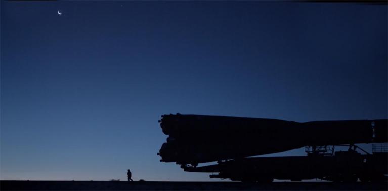 È un momento solenne, che Andrea Sorini comunica nel film-documentario Bajkonur, Terra girato nel 2018, un viaggio attraverso la pianura del Kazakistan per raggiungere la città cosmodromo di Bajkonur. In questo film assistiamo all’uscita nella notte di una Soyuz dal suo hangar, al suo posizionamento sulla rampa e al suo lancio verso la Stazione Spaziale Internazionale. Le immagini si susseguono con una straordinaria forza epica, che culmina con la sagoma scura del razzo stagliata contro il colore impalpabile del cielo al crepuscolo. È il colore filmare della volta celeste.