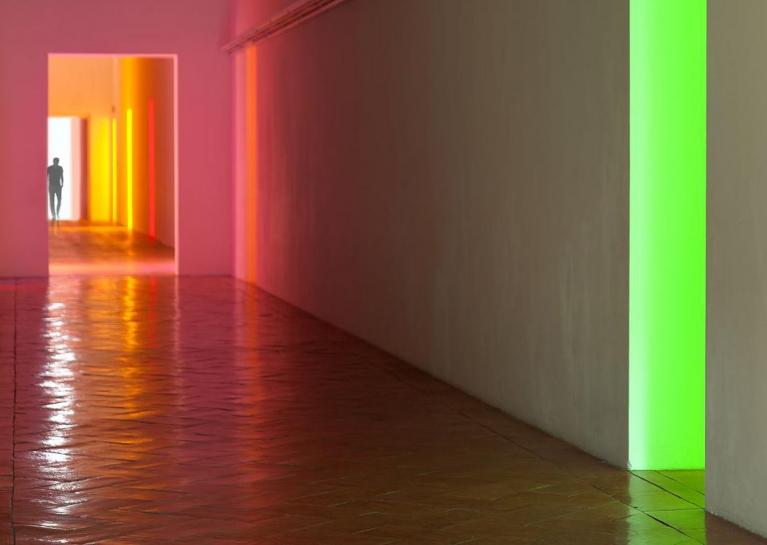 Dan Flavin, Varese corridor, 1976. Villa Panza, Varese. La luce che illumina il corridoio non è quella fluorescente verde, rosa e gialla emessa dai 207 tubi al neon che compongono l’opera site-specific, ma quella che proveniente dagli ambienti laterali con installazioni progettate dallo stesso Flavin. Dono Panza a Guggenheim Foundation. Prestito permanente FAI.