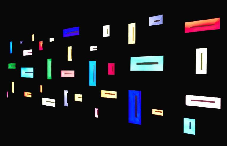 Narciso Silvestrini racconta che il colore può essere inteso sia come aggettivo, sia come sostantivo (aggettivo sostantivato). Il secondo è quello delle cartelle colore. Anche quello filmare del cielo nel film di Sorini, lo stesso osservato attraverso lo schermo di riduzione Skyspace I realizzato nel 1974 dall’artista americano James Turrell nella villa del collezionista a Varese. Quello visto attraverso uno schermo di riduzione è un colore astratto-estratto, precisa Silvestrini. È l’esperienza del colore puro. Il colore inteso come aggettivo è invece quello subordinato alla materialità dell’oggetto, sia come colore superficie proprio della materia che compone l’oggetto, sia come colore assorbito dai pannelli MDF: un colore aggettivato, non sostantivato.