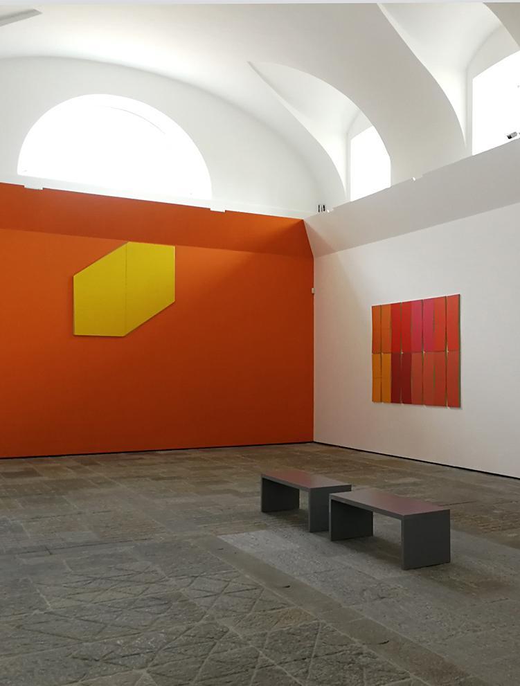 Sean Shanahan, veduta parziale dell’installazione nella scuderia grande. Sulla parete arancione: Taddeo, 2018, olio su MDF. A destra: S.T., 2020-21, olio su MDF. Villa Panza Varese.