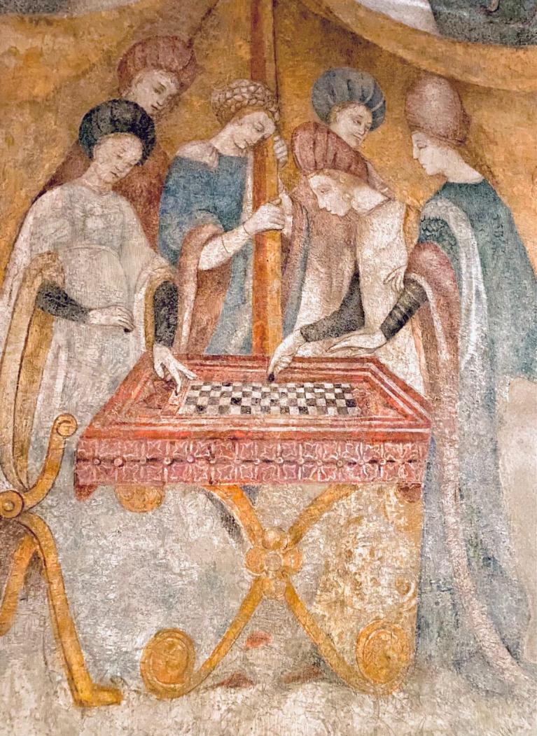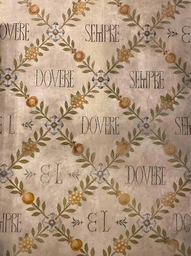 Dopo la discussione, franca e distesa, Martina ci porta in visita alla biblioteca, poi a cena nella vicina Bicocca degli Arcimboldi. Mi pare una specie gioiello sospeso nel tempo. Si tratta del quattrocentesco casino di caccia delle villeggiature della famiglia degli Arcimboldi, una piccola roccaforte (“bicocca”) immersa nel verde suburbano di Milano, e sviluppata su tre piani. Martina ci avverte: rimarremo incantati dagli affreschi, unici nel loro genere, perché ritraggono soggetti prevalentemente femminili, donne placidamente immerse nei loro svaghi. La Sala delle Dame, al primo piano, in effetti è piena zeppa di nobildonne intente alle loro occupazioni. È come se tutta la stanza fosse diventata all’improvviso un’alcova segreta, avviluppata da un baldacchino di tende. Mi sento un’intrusa. Sono al centro e su ogni parete si discostano i veli di altrettante stanze: posso spiare, non vista, le fanciulle, mentre preparano il loro letto per la notte, mentre cantano e suonano. Tre donne dall’altra parte della stanza giocano tra di loro a dama. È un luogo che definirei romanzesco, perché ogni stanza qui è proprio un racconto: al centro si spia, senza permesso (eccetto quello di Martina, che mi autorizza a far le foto a quelle dame). Mi viene un improvviso pensiero: e se prima che leggano i libri li portassimo qui, i centosessanta della rosa? Che poi a chiamarli così sembrano quasi un ordine di cavalieri, in qualche modo imparentati ai personaggi di queste storie. Sulla parete di un’altra piccola stanza sta scritto quello che qui sarebbe, certamente, il loro motto: